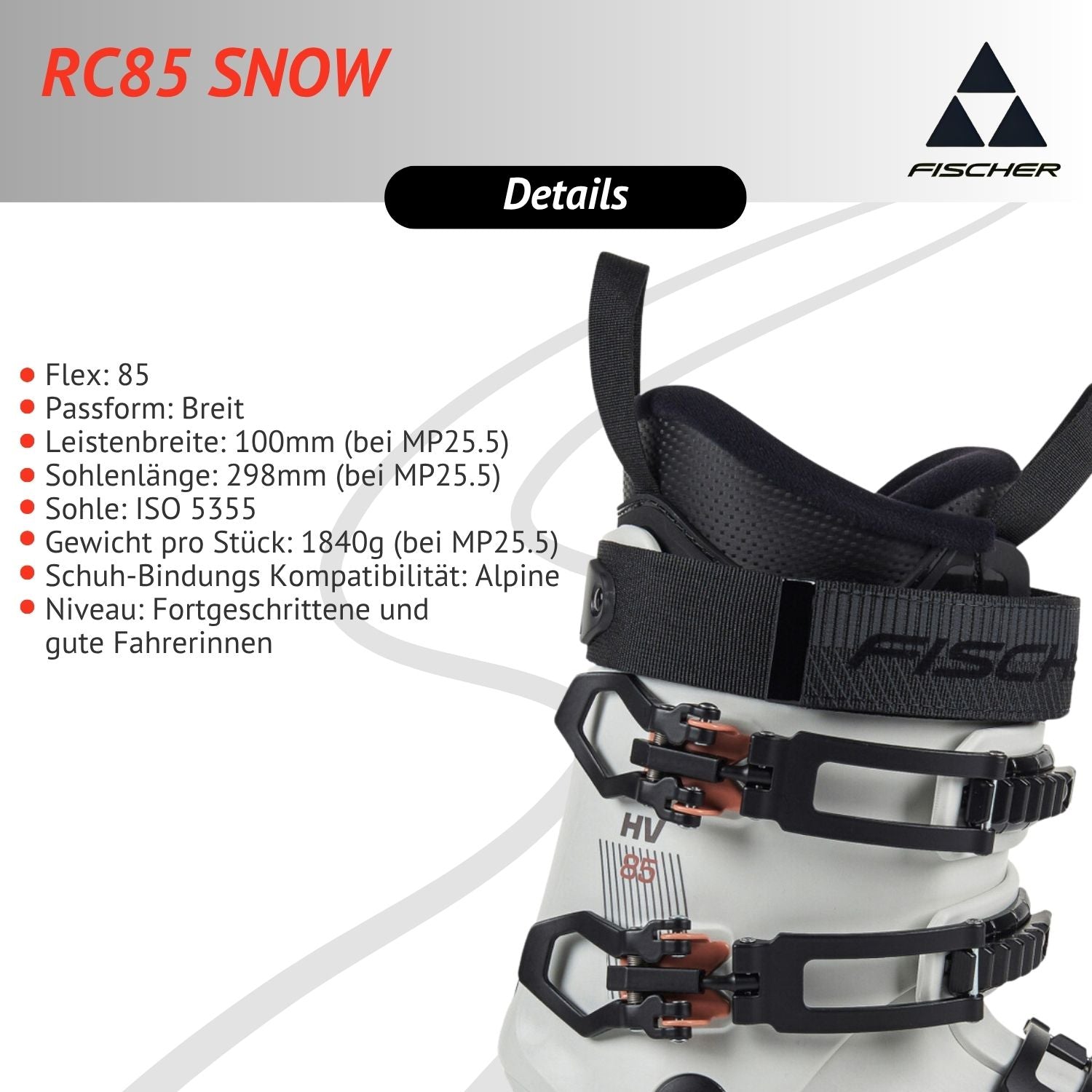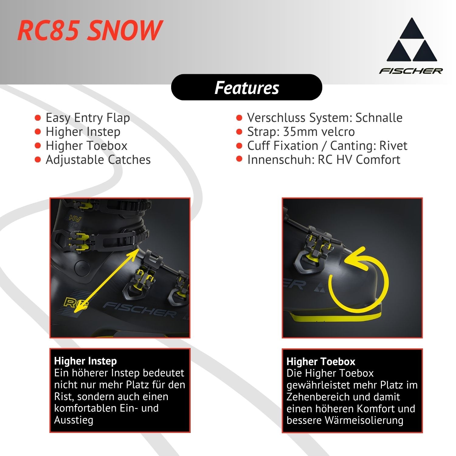 Der RC 85 ist ein leistungsstarker Skischuh mit breitem Leisten. Er bietet auch weiteren Füßen ausreichend Platz, ohne die Kontrolle zu beeinträchtigen. Dank seines sportlichen Designs und der weichen Materialien bietet er hohen Komfort und macht lange Tage auf der Piste noch angenehmer.